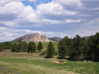 Here is the sculpture superimposed on the mountain. In the video they compare the size of the Mount Rushmore carving. All 4 faces fit in the space of Crazy Horse's hair. They also show the original mountain. There has been alot of rock removed. More than you would think just looking at it. The original mountain extends well above the arm (even over the top of the head) and well beyond the horse's head.